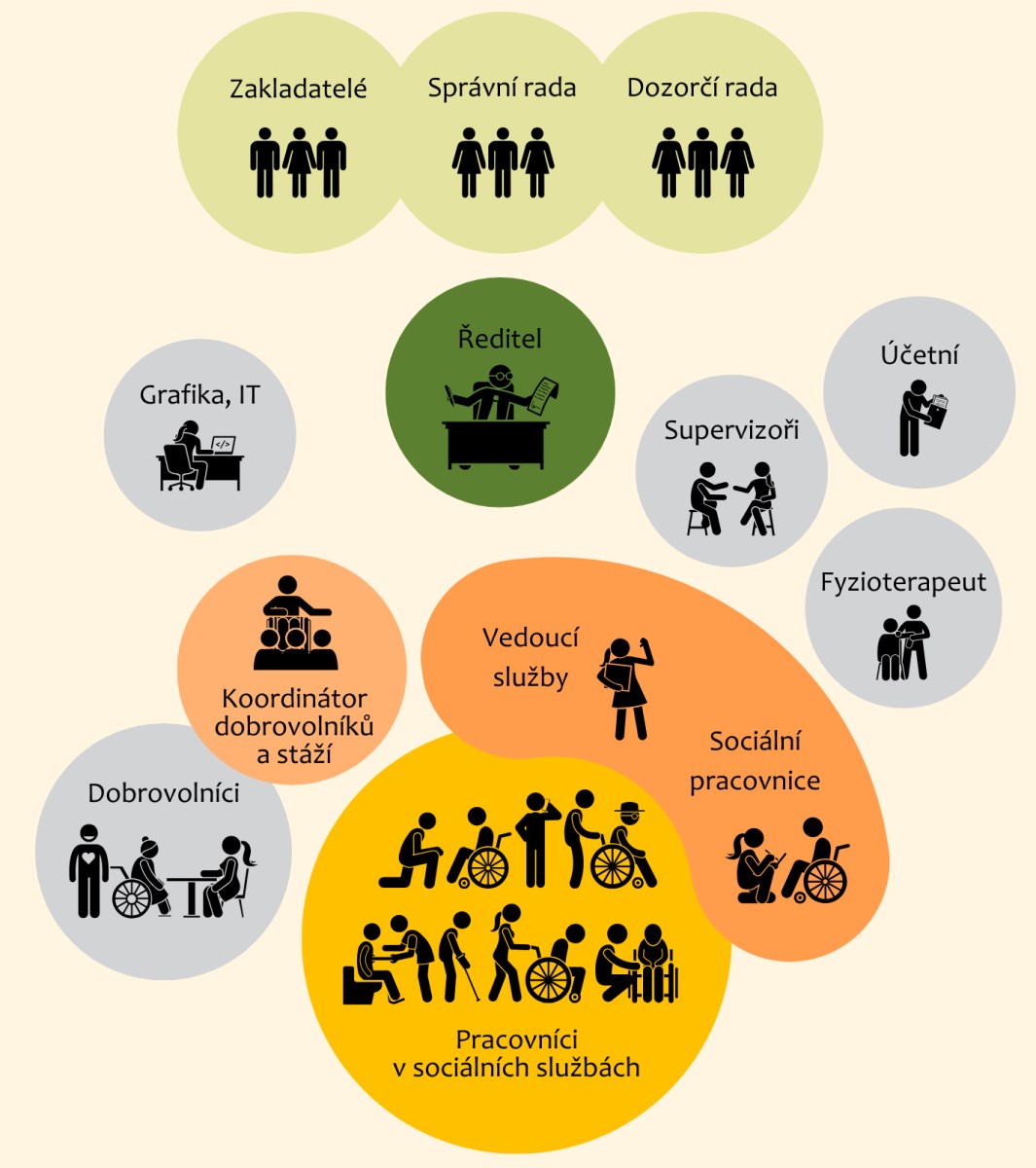 Náš pracovní tým je složen z 14 zaměstnanců a jeho převážnou část tvoří pracovníci v sociálních službách – osobní asistenti/asistentky. V přepočtených úvazcích nás je 9. K tomu externě spolupracujeme např. s účetním či supervizory. Naše služby doplňuje také 10 stálých dobrovolníků, kteří jsou našim klientům a dalším lidem z bezbariérového domu Petýrkova pravidelně nablízku. KVP je jako obecně prospěšná společnost veden ředitelem, přičemž na činnost dohlíží zakladatelé spolu s tříčlennou správní a dozorčí radou.